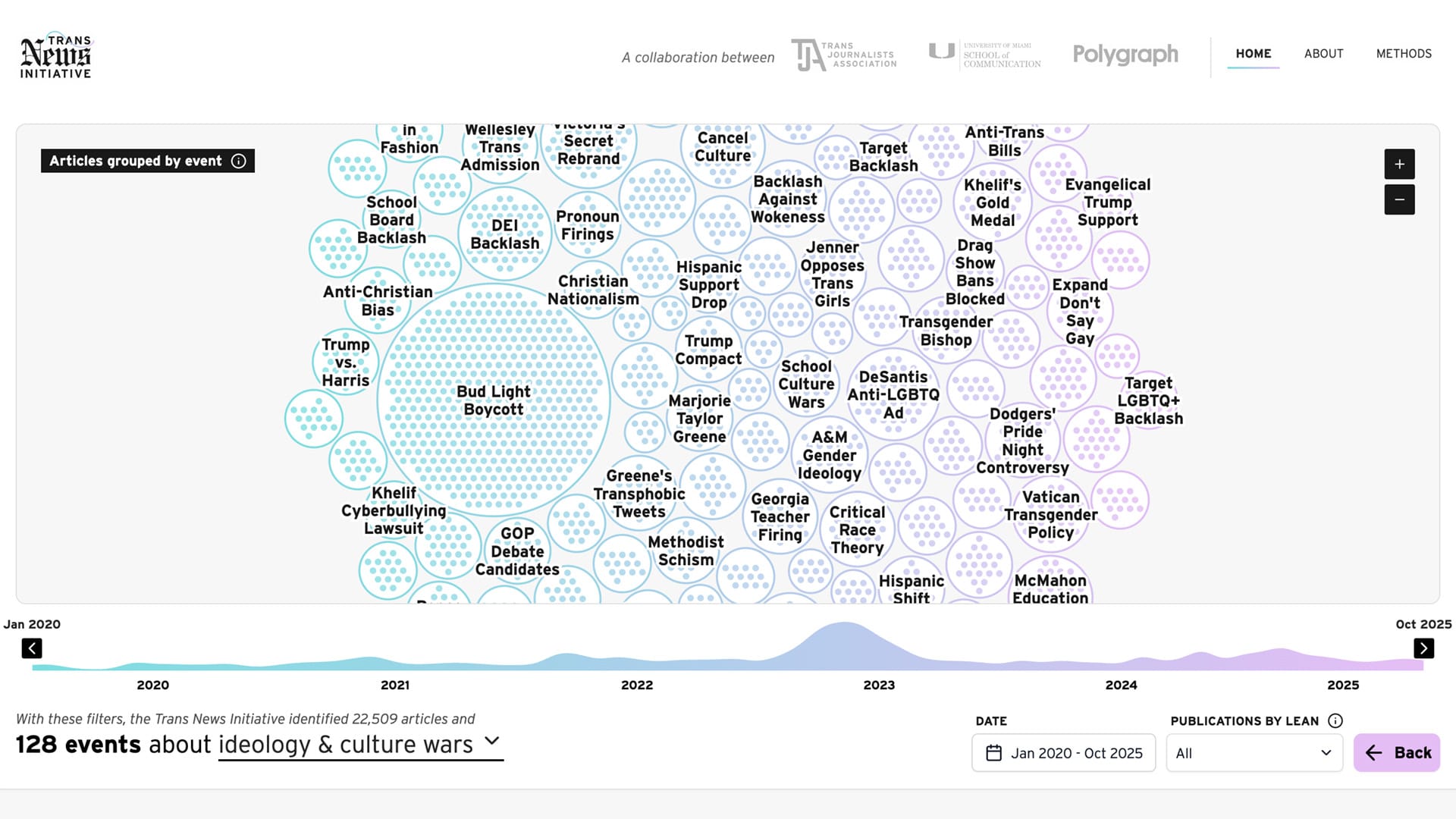 “The Trans News Initiative is a data-driven mirror for news organizations, allowing them to examine themselves. It can help them identify the narratives they have prioritized in the past few years when covering transgender people, and which topics and themes they have downplayed or neglected,” said Alberto Cairo, Knight Chair in Infographics and Data Visualization at the University of Miami School of Communication, who funded the project and guided its conception and development. “By detecting and exploring these patterns in the collected and visualized data, I hope journalists will change how they write and speak about the trans community.”